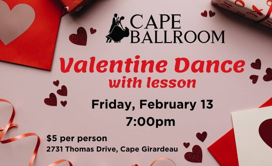 Cape Ballroom Valentine Dance with Lesson, Cape Girardeau, MO - You'll start with a 30-minute lesson, so you don’t have to know what you’re doing to show up. Sigh. of. relief. Bring a date, bring friends, or come solo. 7-9pm. $5 per person. Cash only. No bills larger than $20. Doors open 6:45pm. No smokin', no boozin'. (Sponsored)